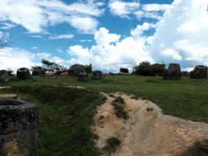 Ik was speciaal afgereisd om de plains of jars te gaan bezoeken in Phonsavan. Dat zijn natuurgebieden vol urnen, waar meerdere mysterieuze spookverhalen over te vertellen zijn. Charlie stelde me voor aan Carl en ik was meteen verkocht. Heel graag ging ik met deze twee helden mee. We hadden een fantastische dag in termen van sightseeing, de natuur en de gesprekken die ik met Charlie voerde en hij met Carl. The plains of jars waren indrukwekkend. Het meest aannemelijke verhaal is dat een overledene in een urn gelegd werd en de laatst genoemde met een deksel gesloten werd. Tussen de jars (sommige zijn wel zes ton) zijn gigantische bomkraters te zien. Er zijn bommen gegooid door de Amerikanen in de oorlog tegen het communisme. Ze hadden bommen over en gooiden ze zomaar op Laos. Er zijn maar drie velden open gesteld voor toeristen, de rest is onveilig, het ligt nog vol met bommen. Ook zijn hier veldslagen gevoerd. Het weer veranderd zo snel dat je alle panoramas op de velden in topsnelheid meemaakt. Met direct zonlicht is het een hele fijne, mooie plek en met donkere wolken voelt het onheilspellend. Het is in te beelden wat hier gebeurd is. We ontdekten een grot tegenover de velden. Weer overal alleen. We reden met Carl naar het tweede veld. De omgeving is daar magisch mooi. Uitgestrekt, bergen, veel groen, kleine dorpjes, kinderen op straat. En ik als enige blanke. We raakten verdwaald en vonden het mooiste uitkijkpunt van deze regio. Uiteindelijk vonden we de plek onder de bomen waar de jars verstopt zijn. Prachtig. Carl verdiende wat water voor zijn oververhitte torso en een klopje erop van ons beide. Heeft hij toch maar weer gedaan. De volgende dag vertrokken we alledrie richting het zuiden, richting Vang Vieng; ik met de bus. Zij hadden meer reistijd. Kwam veel mensen tegen in het hostel en een goede tijd gehad met uitgaan, afgewisseld met hangen in de hangmat (met zeer Europese deephouse op de achtergrond). Waterval bezoeken. Chillen. Was eigenlijk het eerste moment waarin ik niets wilde en hoefde. De hitte en zon hielpen daarbij. Heerlijk!