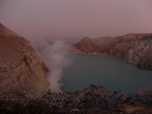 Uiteindelijk aangekomen in een guesthouse dichtbij de vulkaan. Die nacht om 1.30 opgestaan, om het blauwe vuur goed te kunnen zien in de nacht. Na mijn eerste kennismaking met vulkaan Semeru afgelopen jaar, had ik een lichte traumatische ervaring. En wat is de beste manier om een traumatische ervaring te verzachten of te verwerken..? Ik was dus best gespannen. De weg ernaartoe was niet te vergelijken met de Semeru maar sommige stukken waren best pittig. Onderweg werden gasmaskers verhuurd voor een aardige som, het is duidelijk dat de locals geld willen maken. Ik had echter wel mijn twijfels, bijna iedereen had er een. Na de afdaling in de krater kwamen we aan bij het blauwe vuur. Het was niet te geloven, zo indrukwekkend. Er kwamen grote wolken vanaf, maar de wind stond gunstig. We stonden heel dichtbij en waren een van de eersten, we hadden de hike op topsnelheid gedaan. Ik ging helemaal op in het fenomeen en Landon ook. Daardoor zagen we het gevaar van de rook die van het vuur afkwam niet en het overviel ons als een verstikkend deken. Ik probeerde adem te halen maar het werd alleen maar erger. Het brandde in mijn longen en ogen en het enige waar ik aan dacht was dat damn gasmasker wat ik had moeten huren. Ik draaide me half om naar Lando en wees naar de weg terug. Ik kroop omhoog, probeerde mijn vest uit mijn tas te halen, waardoor mijn camera op het gesteente viel. Ook dat nog, camera stuk, dacht ik. Ik drukte het vest tegen mijn mond en neus maar het hielp niets. Ik stikte bijna en mensen liepen heel droog voorbij. Toen ik mezelf opgetrokken had aan de stenen en mijn zicht wat beter werd, zag ik een gids lopen en er bungelde een gasmasker in zijn hand. Ik kroop naar hem toen en griste het uit zijn hand en drukte t op mijn gezicht. Ik denk dat hij aan mijn gezicht zag hoe desperate ik was. Maar ik wilde terug, niet alleen om nog meer van het blauwe vuur te zien maar moest ook Lando vinden die nog altijd daar was. De gids vroeg of ik mee wilde lopen en met knikkende knieën ging ik terug. Daar stond ik weer. Het was nog mooier dan de eerste keer. Maar het gasmasker hielp nauwelijks. Bij de tweede wolk kreeg ik minder binnen, maar het was toch heftig. Ik riep Landons naam maar kreeg geen gehoor. Ik besloot op dezelfde plek te blijven en gewoon af te wachten. En uit het niets was hij daar en hij trok me mee naar een lager gedeelte waar het zicht nog beter was. Hij vertelde me in een aantal woorden dat hij dezelfde ervaring had als ik. De volgende wolk die kwam, hurkte ik, hield ik mijn adem in en verborg ik mijn hoofd in mijn armen. Na een aantal minuten zijn we omhoog geklommen en het werd langzaam aan al licht. Toen we op de rand van de krater stonden kon ik zien waar we gestaan hadden en ook hoe gevaarlijk het is. En het uitzicht was fantastisch. Elke minuut veranderde het daglicht en de sfeer, dat kun je op de fotos zien. Er was niemand. Het water in de krater turqoise, de plek waar we hadden gestaan geel van het zwavel, het gesteente ijzig grijs, de hemel kleurde langzaam. Het gebergte achter ons immens en bruin en heel groen. Nog nooit in mijn leven zo iets gezien. Het was het half doodgaan dubbel en dik waard. En achja, ben niet voor niets gestopt met roken. We spraken over het feit dat locals de zwavel winnen en daar lang achter elkaar zijn, zonder gasmasker. Ongelofelijk.