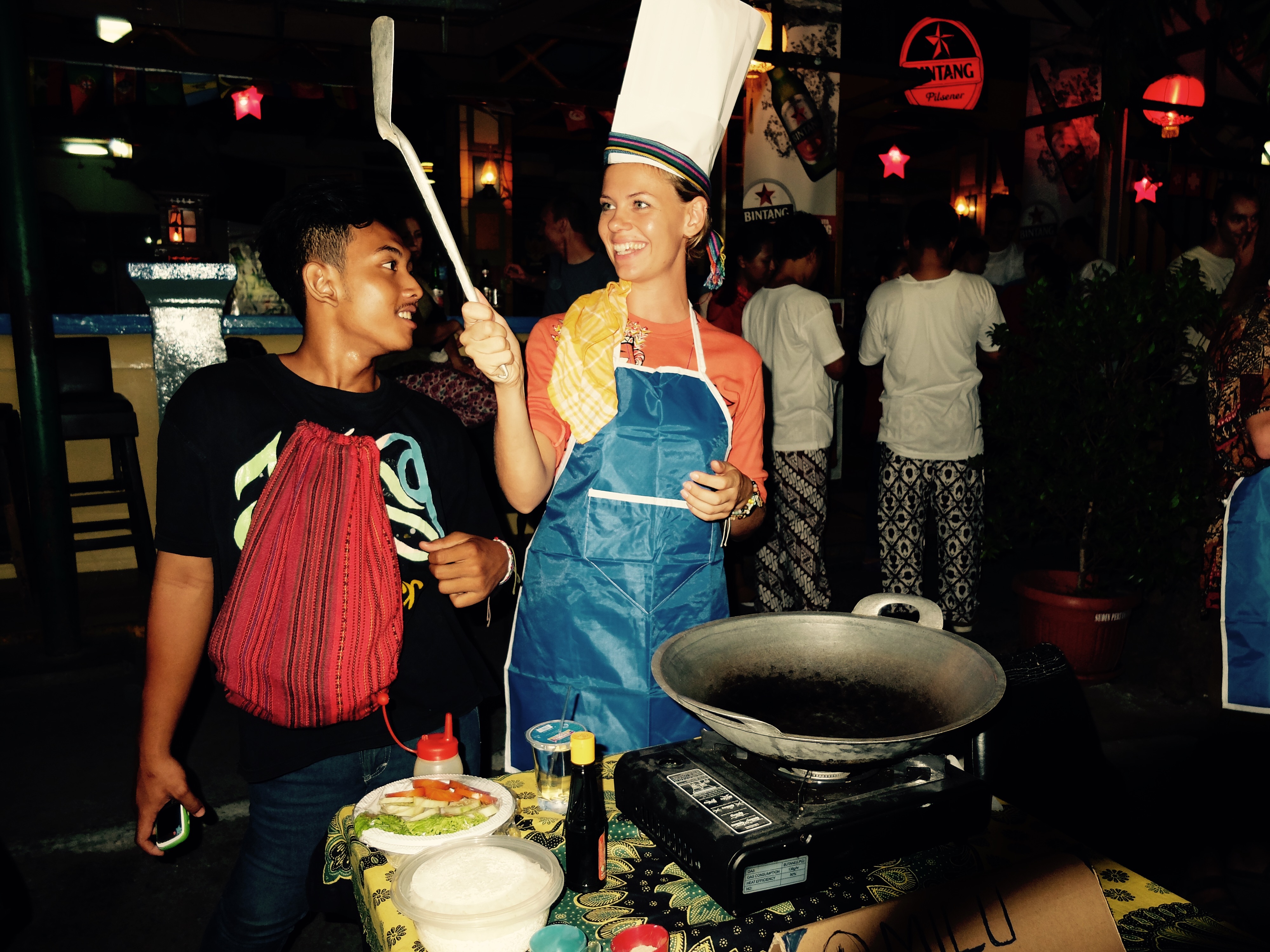 Een van de redenen waarom ik moest blijven in Jaksa was omdat er een festival was, wat voor mijn vrienden heel veel betekent. Het is een jaarlijkse ontmoetingsdag voor alle mensen uit Jakarta. Er zijn stands, lekker eten, mensen verkopen spullen en er is muziek. Ik bracht meer tijd door met hen en ik werd gevraagd om s avonds mee te doen aan een Nasi Goreng contest. Grappend zei ik ja natuurlijk, doe ik wel even. Beetje koken, hele tijd niet gedaan. We gingen samen op zoek naar nog meer toeristen, die eigenlijk heel moeilijk te vinden waren. Laagseizoen! We hadden er uiteindelijk genoeg en ik was er een van. Ik kreeg van mijn Javaanse vader uit t hostel, ons huis, een zelf opgeschilderd tshirt met jalan jaksa erop en een sjaaltje uit Lombok. Ik trok het meteen aan en ik hoopte dat het mijn eer een beetje zou redden. Ik had namelijk echt geen idee hoe de authentieke nasi goreng smaakte EN hoe je die moest maken. Super trots was mn java vadertje toen ik daar stond met zijn shirt en sjaaltje, gewapend met een spatel. Ik kon het zien aan zijn gezicht. En ook mijn vrienden waren daar en een van hen smeekte me niet te verliezen. Oké, het is dus best een big deal, dacht ik. Kon alleen weinig veranderen aan t feit dat ik t wel kon bereiden maar niet op smaak kon brengen zoals de indo’s dat doen. Ik kreeg een hoge koksmuts en schort.. oké het werd echt heel serieus genomen! Er kwamen afgevaardigden uit Jakarta om het eten te proeven en de looks te beoordelen. Ze waren allemaal heel mooi aangekleed. Er waren hordes mensen toen er na twee uur wachten eindelijk werd afgeteld. Mijn vrienden hielden de spanning bijna niet meer. Ik bakte een ei voor on top om het wat te laten lijken. Er werd geschreeuwd ‘more ketjap’, ‘more chili’. Ik deed braaf maar wat er geroepen werd, van de hoeveelheden had ik geen idee. Er kwam een cameraploeg en we moesten opeens rechtop gaan staan met ons gerecht in de hand. De burgemeester kwam langs om te kijken naar onze gerechten. Hij werd onthaald als een koning. Ik had een glimlach op mijn gezicht die er niet meer afging. De honderden fotos (ook veel selfies) en de vriendelijke mensen. Dan denk je nu dat het verhaal klaar is, maar nee. We werden verzocht om met ons gekregen gratis bier (wat in deze streek nogal prijzig is, vanwege het feit dat de meerderheid moslim is) mee te nemen en mee te lopen. Onderweg nog meer fotos. Canadees Willy vroeg me wat ik met de rode pepers had gedaan. ‘Er allemaal ingegooid’, antwoordde ik trots. Aan zijn verbaasde gezicht te zien was dat echt wel een beetje teveel van t goede. Ik was echt een Bintang (merk bier maar betekent ook celebrity/star). Heel weird. We mochten op fancy stoelen zitten en werden ook nog gevoed. Daarna werden we een voor een naar voren gehaald. Met een hele aankondiging. Bizar. We kregen cadeaus en de nummer 1, geld. Dat was ik dus niet, de halloween smilie op het ei had niet geholpen. Maar toen gratis Bintang en ik zag de blik van Risma, zij was niet happy tussen de toeristen. En ik was ook wel weer ff klaar. Mijn vrienden uit Jakarta namen me mee, naar waar wist ik niet maar ik moest me serieus aankleden en nu komt het … sexy! Ik stak mezelf in de enige jurkje die in mijn backpack te vinden is en .. geen high heels… Ze probeerden me in hun maatje 37 schoenen te proppen, maar deze Belanda voeten zijn veel te groot. Dus het werd toch echt Nikies aantrekken onder het jurkje! Lekker stampen. Kon ermee door vonden ze. Not to bad. Fair enough. We reden naar de verrassingsplek.. het bleek een vijfsterren hotel, heel groot, met een ondergrondse club. De Canadees kwam er niet in met sandalen en gescheurde broek, backpackerstijl. Ik verschool mijn schoenen.. Die avond heb ik sugardaddy’s uitgekleed door drankje naar drankje te krijgen, die natuurlijk onbetaalbaar waren. Wat een avond. En ik mis mijn vriendjes nu al ontzettend. Ze hebben mij alles gegeven en ik hen. En het afscheid nemen een dag later viel me zwaar. Ik ben zoveel over hen te weten gekomen, allen hebben ze een verhaal. Voor altijd bij me draag ik ze, deze mensen. Hopend op nog meer van dit soort ervaringen denk ik hier nog even over na. Zorg voor elkaar daar in Nederland, vergeet elkaar niet!